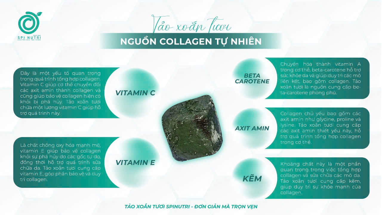 Tảo xoắn chứa nhiều dưỡng chất như vitamin B, sắt và các khoáng chất thiết yếu, giúp cấp ẩm cho da, duy trì độ mềm mịn và ngăn ngừa tình trạng da khô. Ngoài ra, tảo xoắn còn hỗ trợ tái tạo tế bào da, giúp da khỏe mạnh và đều màu.