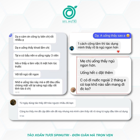 Một trong những lợi ích đáng chú ý của sinh tố tảo xoắn là khả năng hỗ trợ cải thiện giấc ngủ. Nhiều khách hàng cho biết rằng sau khi sử dụng sinh tố tảo xoắn, họ có thể dễ dàng chìm vào giấc ngủ và ngủ sâu hơn. Tảo xoắn chứa một lượng lớn chất chống oxy hóa và các khoáng chất như magiê, có tác dụng thư giãn cơ thể và giảm căng thẳng. Magiê trong tảo xoắn giúp điều hòa hệ thần kinh, giúp cơ thể thư giãn và dễ dàng đi vào giấc ngủ. Điều này giúp những ai gặp vấn đề về mất ngủ hoặc giấc ngủ không sâu có thể tìm thấy một giải pháp tự nhiên để cải thiện chất lượng giấc ngủ. -