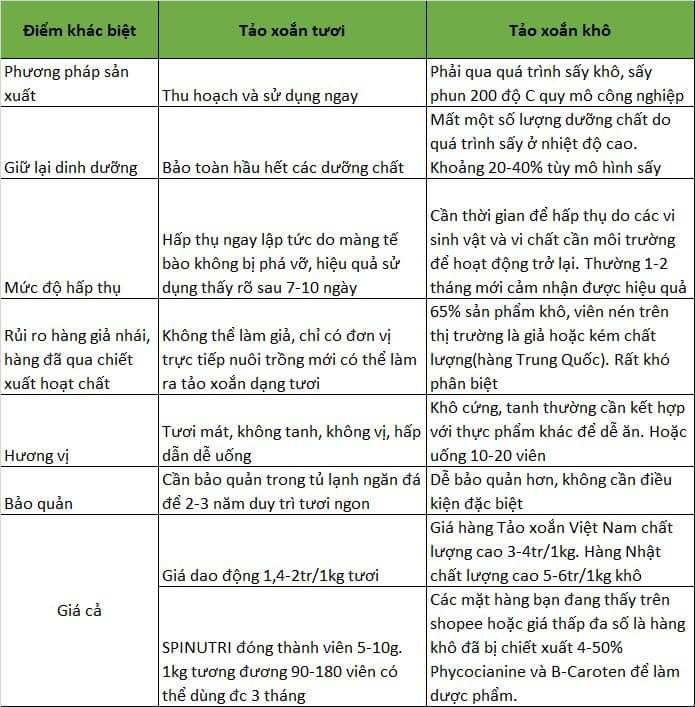 Tảo xoắn khô là tảo đã qua chế biến, sấy khô và nghiền thành bột mịn hoặc nén viên. Trong khi đó, tảo xoắn tươi là tảo vừa thu hoạch, giữ nguyên hàm lượng dưỡng chất và các enzym tươi tự nhiên có thể bảo quản trong tủ lạnh và sử dụng trong các món ăn, sinh tố, hoặc nước ép, mang lại hương vị tự nhiên hơn so với tảo xoắn khô