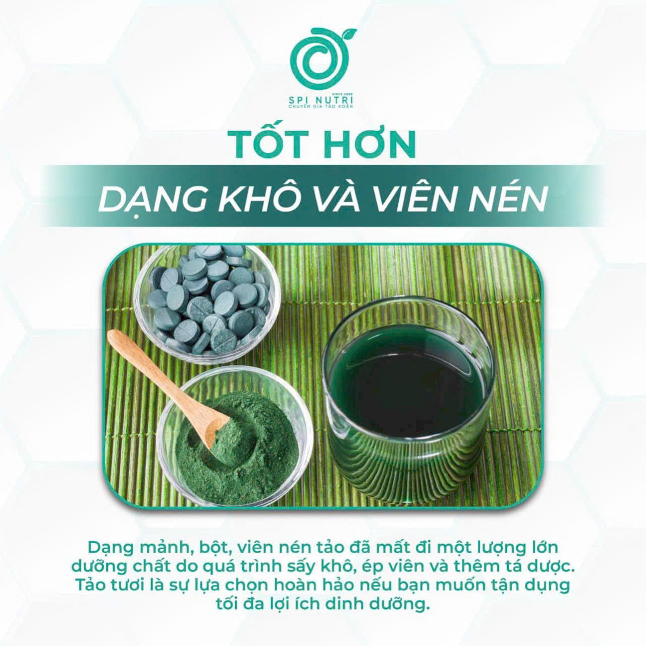 Một trong những lý do chính là tảo xoắn tươi giữ nguyên được nhiều dưỡng chất và enzym có lợi mà dạng khô không thể có. Trong quá trình chế biến và sấy khô, một phần dưỡng chất trong tảo sẽ bị mất đi, đặc biệt là các vitamin và khoáng chất dễ bị phân hủy. Tảo xoắn tươi giúp cung cấp nguồn dinh dưỡng nguyên vẹn và dễ dàng hấp thụ vào cơ thể.