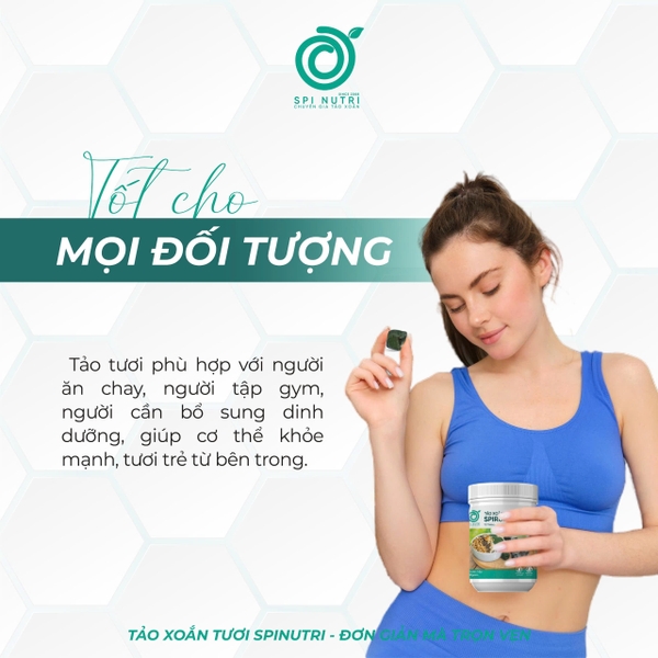 Tảo xoắn tươi là một trong những thực phẩm dễ dàng bổ sung vào chế độ ăn uống hàng ngày của người ăn chay. Bạn có thể dùng tảo xoắn tươi trong các món ăn như sinh tố, nước ép, salad hoặc thậm chí là súp. Với hương vị nhẹ nhàng và dễ kết hợp, tảo xoắn tươi không chỉ dễ dàng chế biến mà còn giúp nâng cao giá trị dinh dưỡng cho các món ăn.