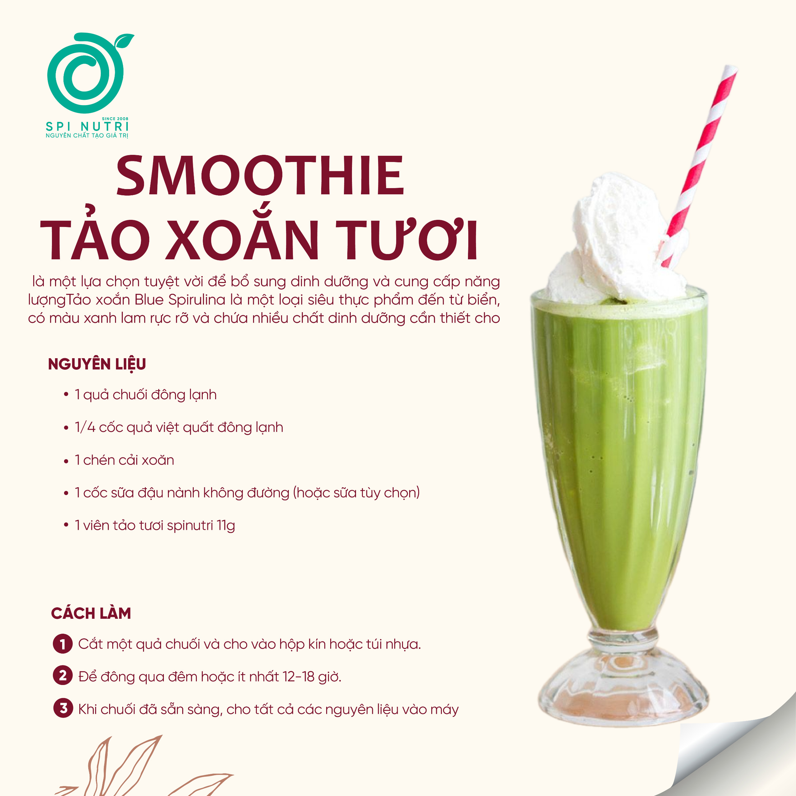 Tảo xoắn dạng tươi của SPINUTRI rất dễ sử dụng. Nó không có mùi tanh như tảo khô và có thể mix đa dạng với nhiều công thức đồ uống khác nhau