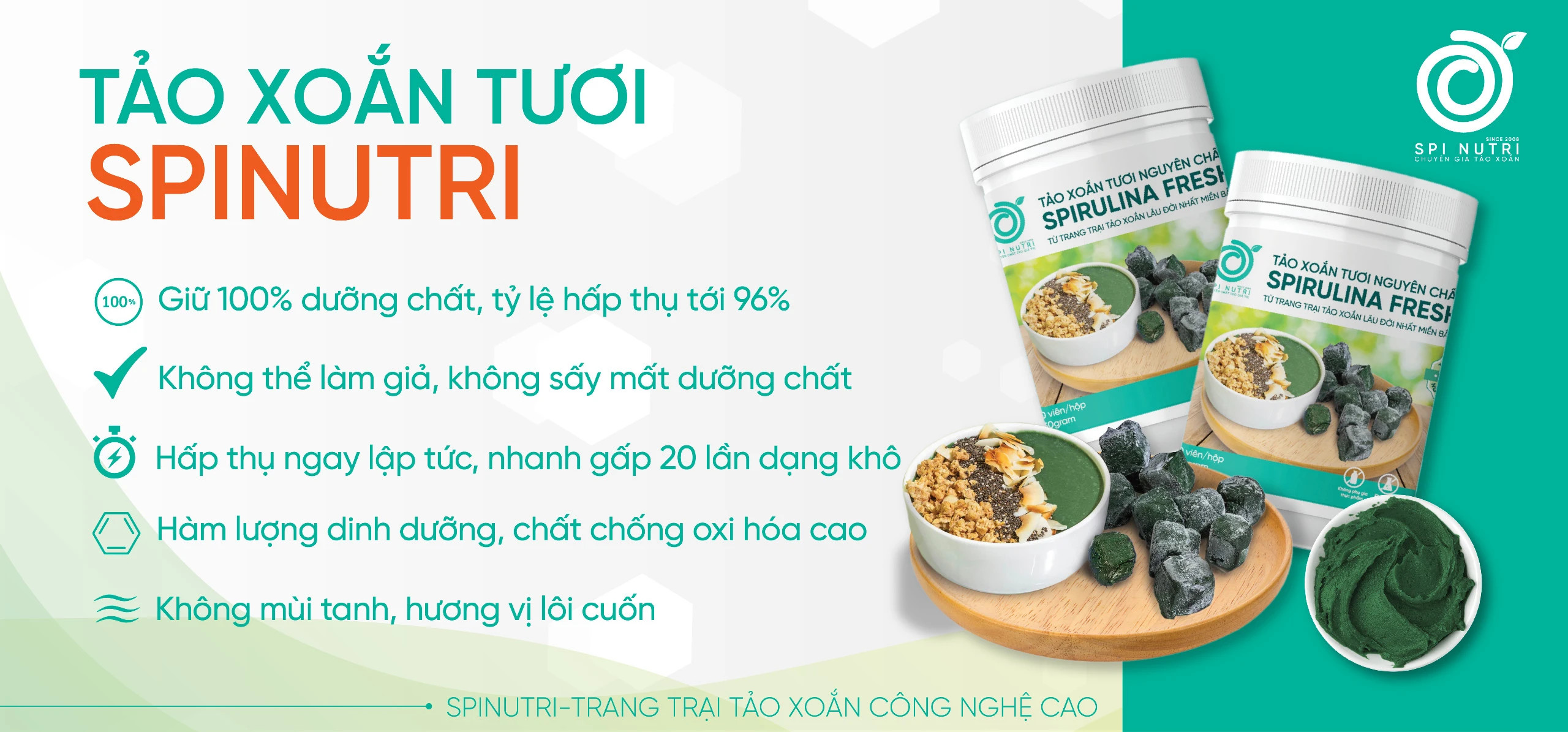 Tảo xoắn tươi spinutri là tảo xoắn tươi nguyên chất cấp đông ngay sau khi thu hoạch, được sản xuất trực tiếp tại trang trại của Spinutri. Bởi thế nên nó giữ trọn vẹn được 100% dưỡng chất quý giá nhất của tảo xoắn.