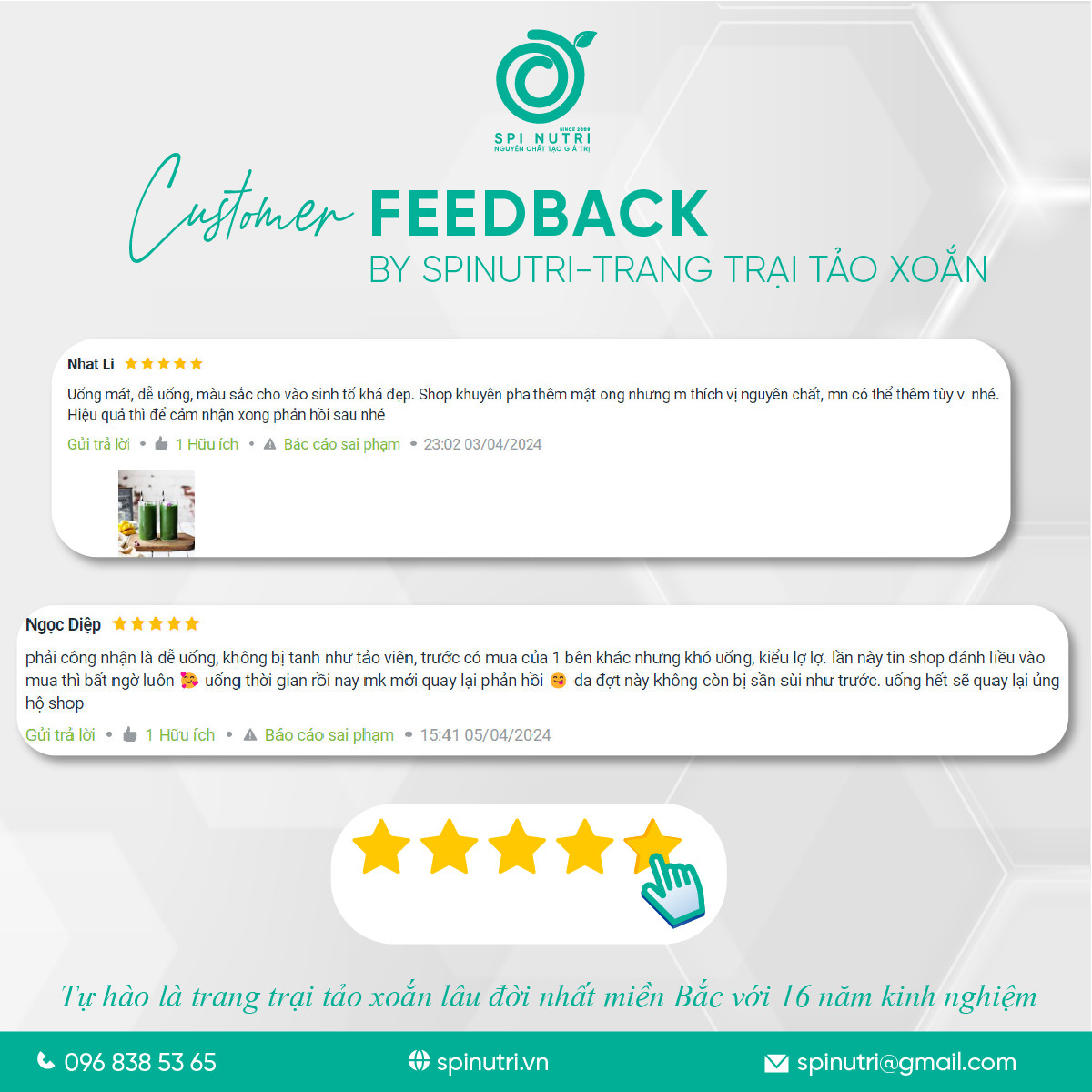 Giá trị lớn nhất Spinutri mang lại không chỉ nằm ở sản phẩm của mình mà còn ở sứ mệnh lan tỏa cộng đồng về lợi ích to lớn của Tảo Xoắn tươi đối với sức khỏe và môi trường. Spinutri tự hào là minh chứng cho tình yêu và sự tận tâm với đất mẹ, cũng như niềm tin vào một lối sống xanh, bền vững.